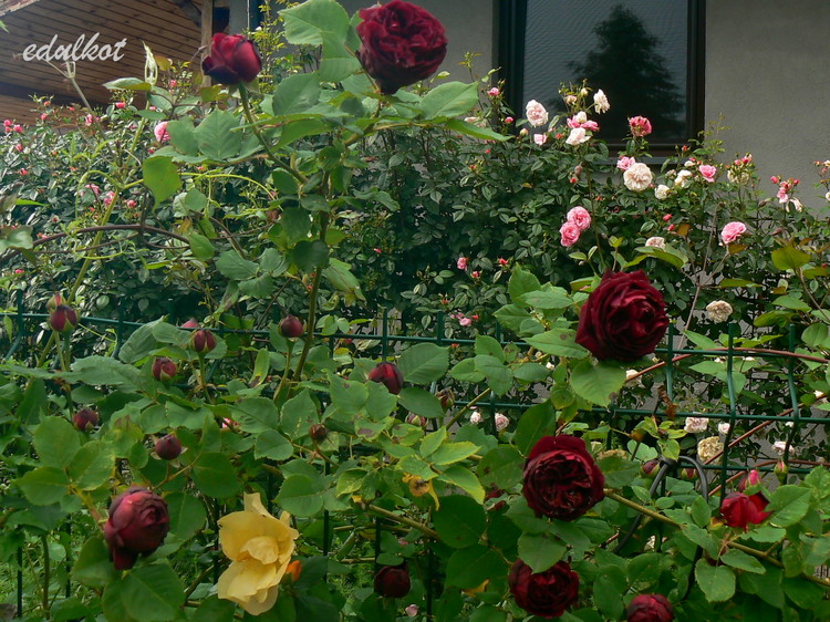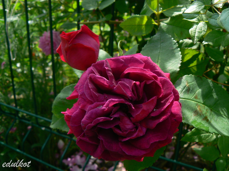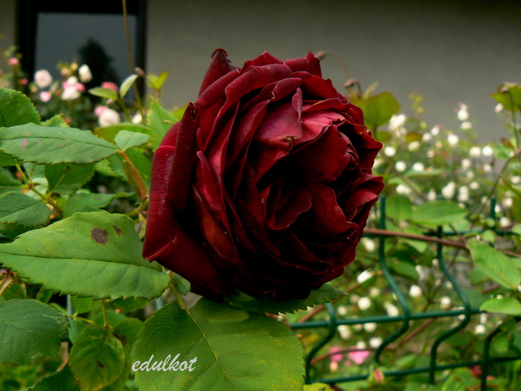 Kwiaty: duże 8-9 cm, bardzo pełne (ponad 40 płatków), aksamitno-czerwony częściowo brązowawy do fioletowego pod koniec kwitnienia, w słońcu przypalają się, pędy prawie bezkolcowe;