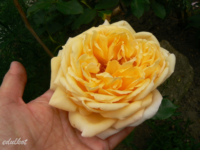 Kwiaty: bardzo duże, pełne (26-40 płatków), złoto-żółte z ciemniejszym środkiem, osadzone pojedynczo na pędach;