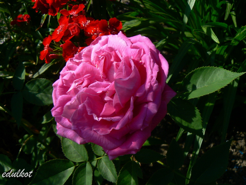 Kwiaty: bardzo duże, półpełne (16-25 płatków), karminowo-różowe, powtarza kwitnienie;