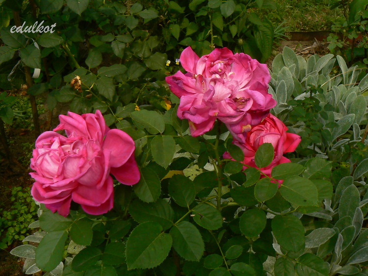 Kwiaty: duże, półpełne, wiśniowe lub czerwono-różowe z żółtymi żyłkami, powtarza kwitnienie, kolczasta;