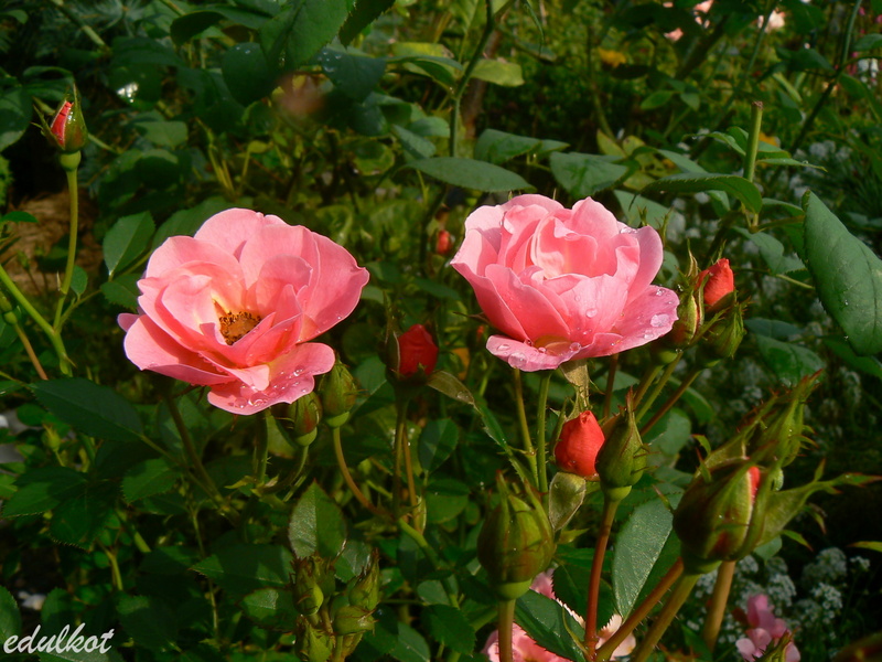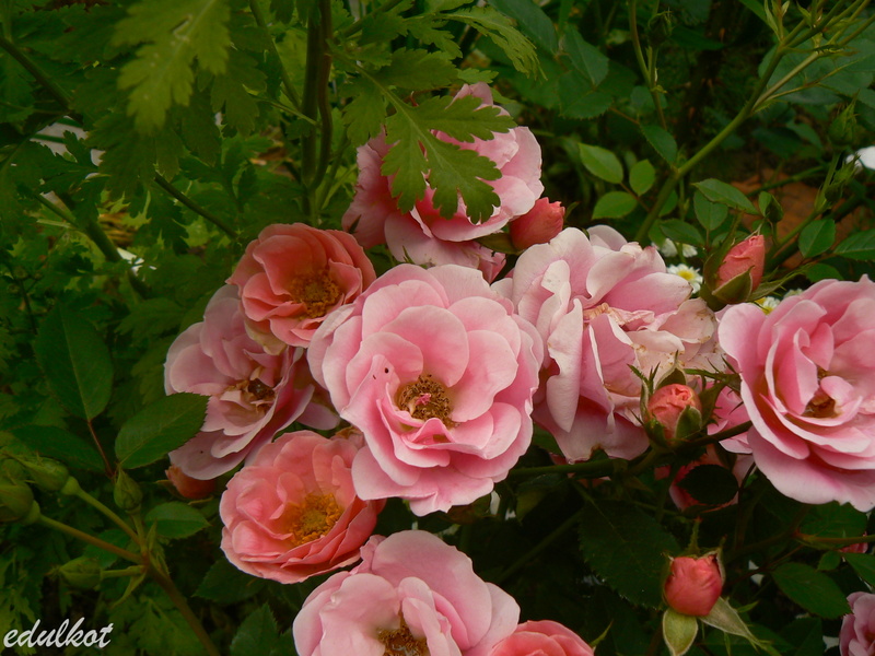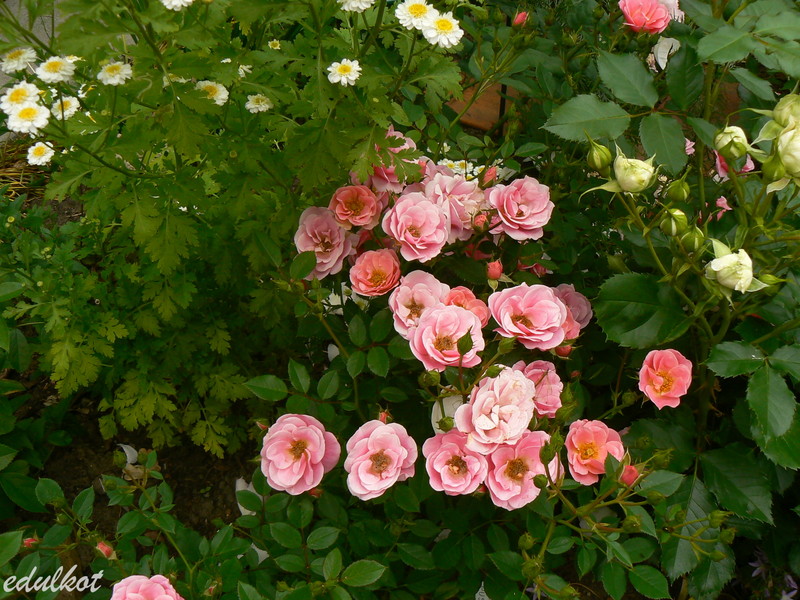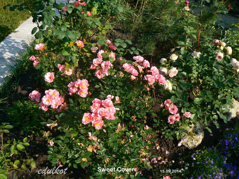 Kwiaty: małe 3-4 cm, półpełne (9-16 płatków), różowe, kwitnie cały sezon, kwiaty same odpadają po przekwitnięciu;