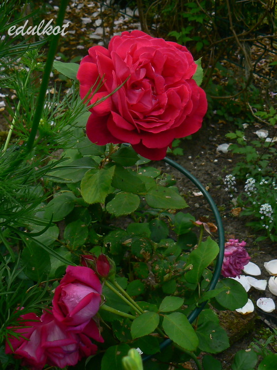 Kwiaty: duże 9 cm, pełne (26-40 płatków), rozetowe, czerwone, powtarza;