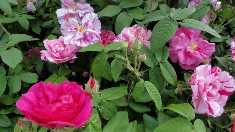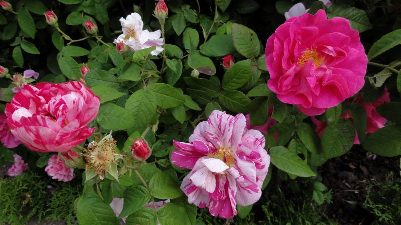 Rosa Mundi, Rosa gallica var. variegata, La Panachée, La Villageoise, Rosier de France à fleurs panachées i inne