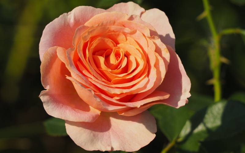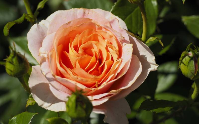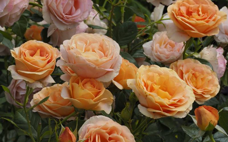 Kwiaty: miedziano-brzoskwiniowe, wpadające w pomarańczowy, a nawet różowy; mocno wypełnione ( Ø: 8 cm ),