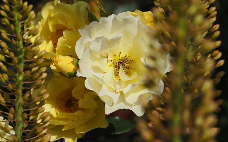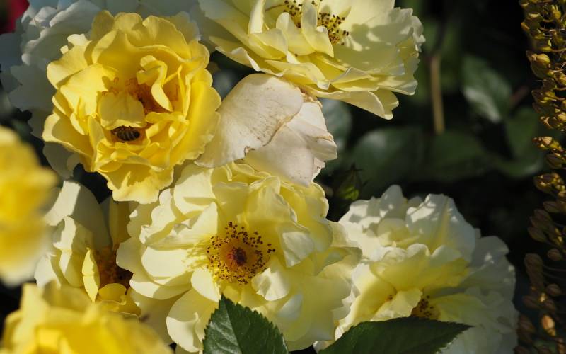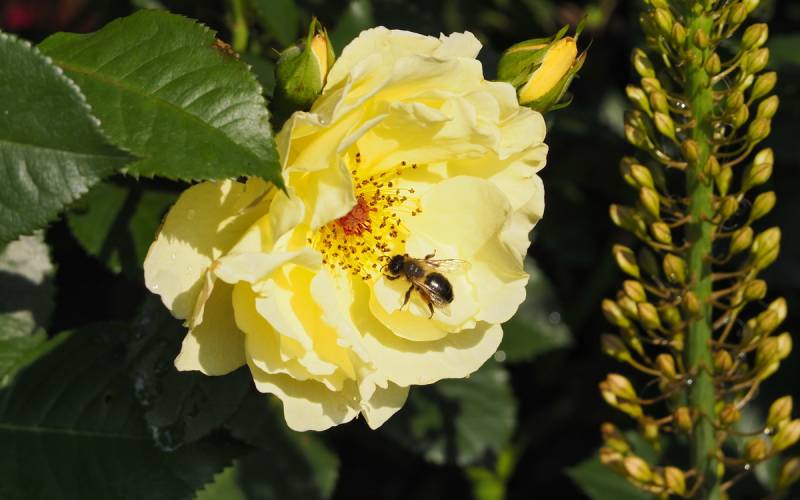 Kwiaty: jasnożółte, fantazyjne pofalowane ( Ø: 8-9 cm ) półpełne z widocznym brązowym środkiem i ładnymi pręcikami. Ściągają do ogrodu mnóstwo pszczół, a jesienią dodatkowym atutem jest wysyp atrakcyjnych owoców.