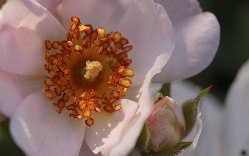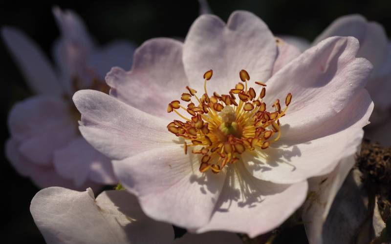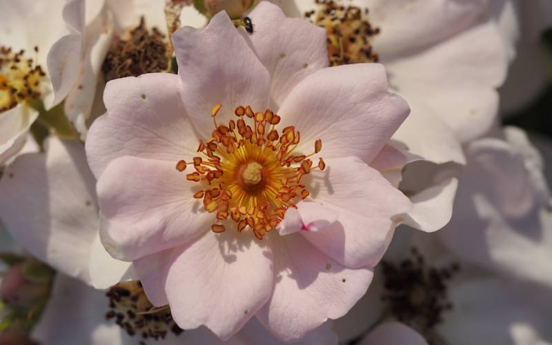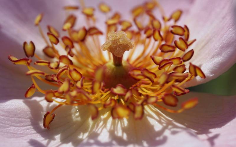 Kwiaty: jasnoróżowo-liliowe, pojedyncze ze ślicznym wachlarzem pomarańczowo-czerwonych pręcików ( Ø: 4-6 cm ); kwitnie niestrudzenie przez cały sezon, sama czyści się z niechcianych płatków