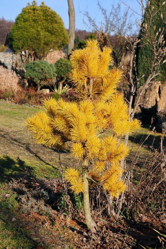 Pinus contorta 'Taylor's Sunburst' wiosną zachwyca złotymi przyrostami.