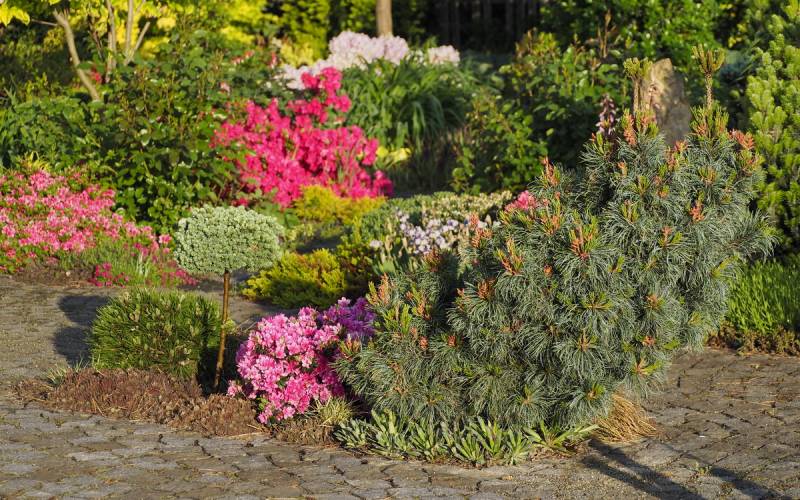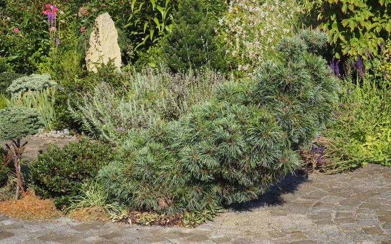 Sosna drobnokwiatowa 'Tanima-no-yuki' zdrowo przyrasta na tylko lekko ocienionym stanowisku.