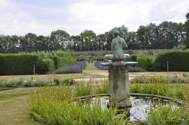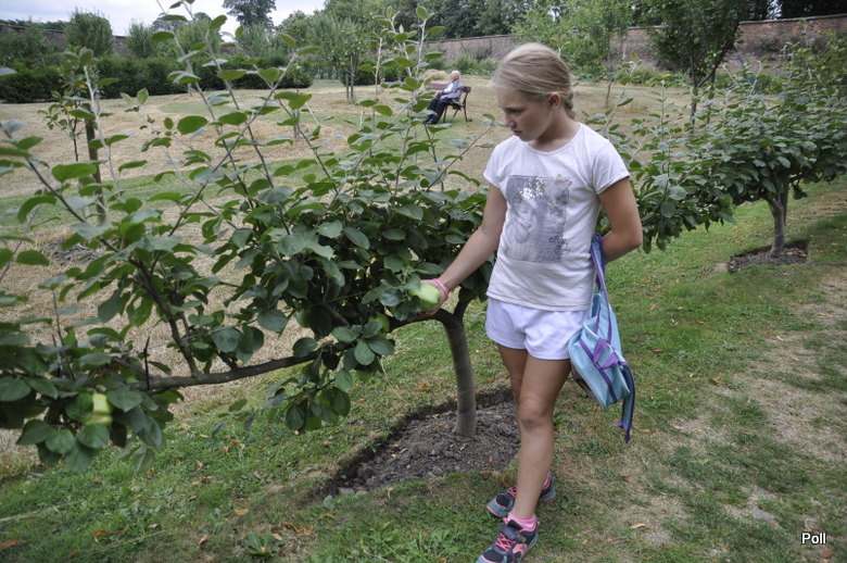[1] Angielski ogród kuchenny otoczony murem z rabatami ozdobnymi oraz ziołowymi przy pałacu na Warmii, Polska.