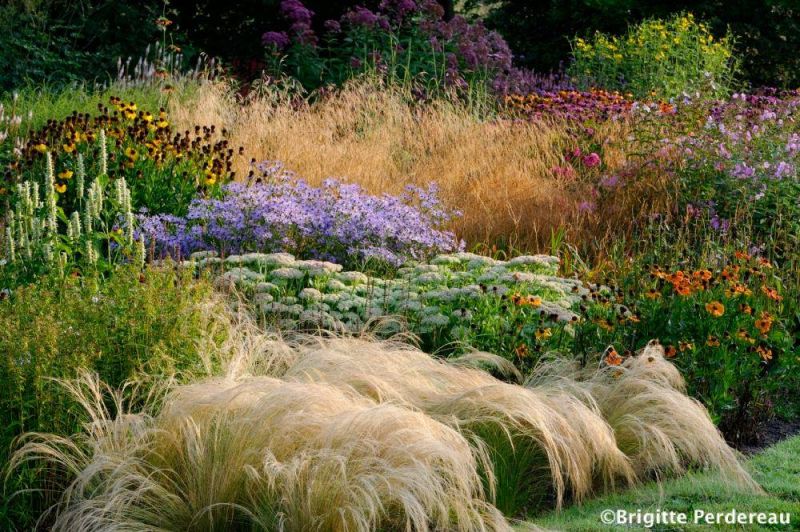 Rośliny: Byliny i trawy sadzimy razem w większych i mniejszych grupach lekko się przenikających na swoich brzegach. Efekt ma być taki jakby nasiewały się tu naturalnie tworząc efekt kwietnej łąki. Wysokie i niskie rośliny sadzimy na zmianę, żeby efekt był bardziej zróżnicowany i przez to spektakularny. Pamiętajmy jednak żeby niższe rośliny sadzić bliżej frontu/brzegu rabat a wyższe z tyłu i w środku. Podobnie dobieramy kolorystykę, sadząc na przemian grupy roślin o kontrastowych barwach. Koniecznie musimy pamiętać aby sadzić obok siebie rośliny które kwitną w tym samym czasie tworząc pary.