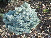 Rośnie w lekko spłaszczoną kulkę odznaczając się zielono-niebieską barwą igieł. Po 10 latach osiągnie wymiary 30x40 cm.