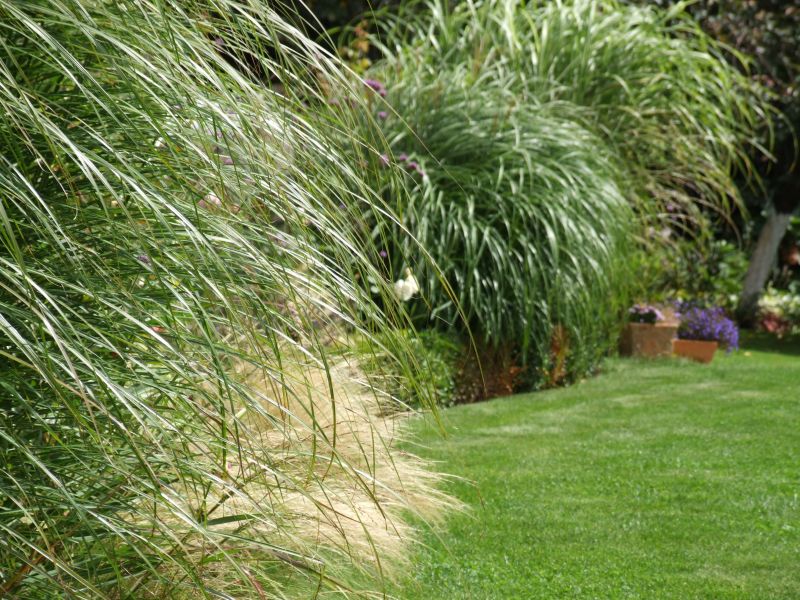 Najpopularniejszymi wysokimi trawami są miskanty. Jest ogromna ilość odmian miskantów i poza cukrowym są nieinwazyjne. Najwyższe są odmiany giganteusa. Poza tym możesz jeszcze przyjrzeć się trzcinnikom. Też ma wysokie odmiany, ale jest bardziej ażurowy, nie będzie więc stanowić szczelnej przesłony.