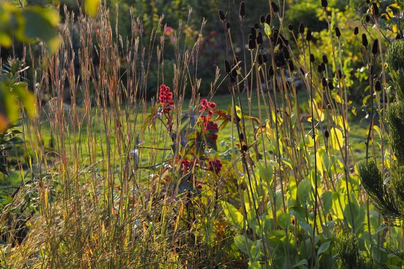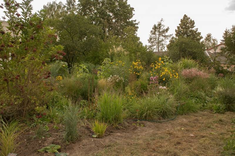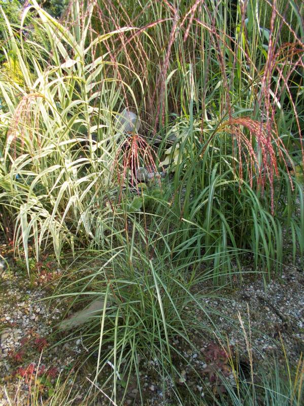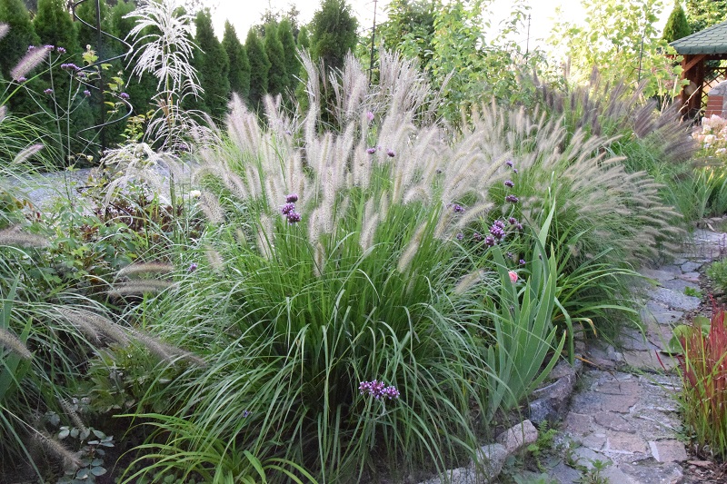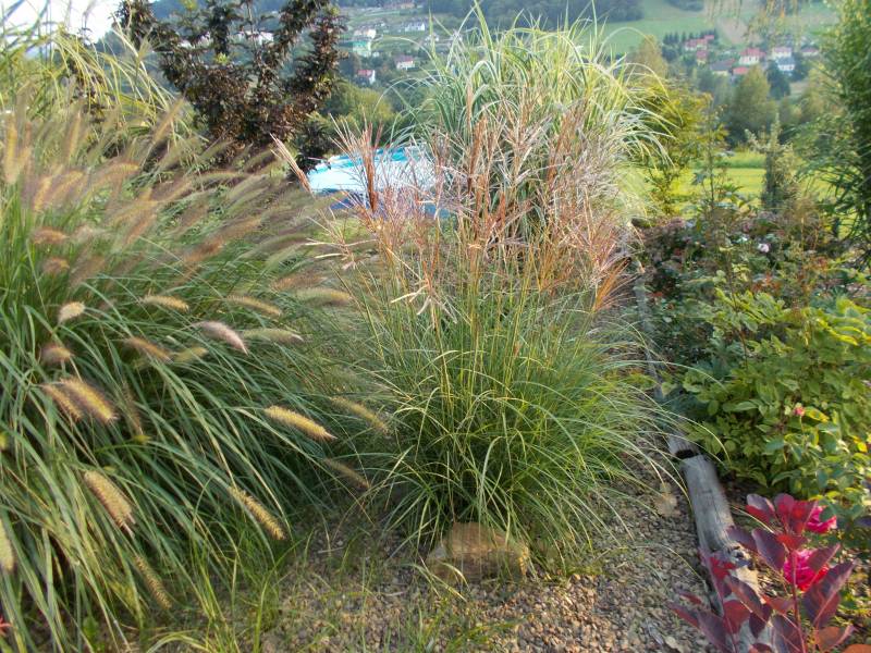 przy tarasie rośnie proso Nican, na przemian z miskantem Mysterious Maiden, ale ten ostatni nie zachwyca, bo straszna w tym miejscu susza
