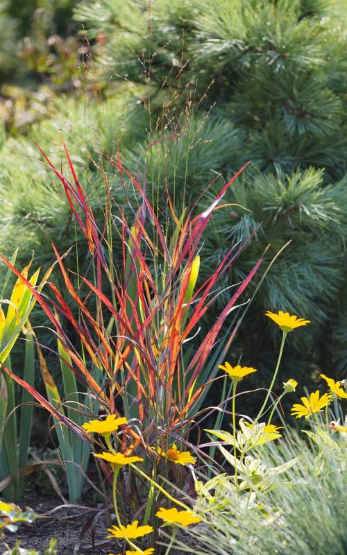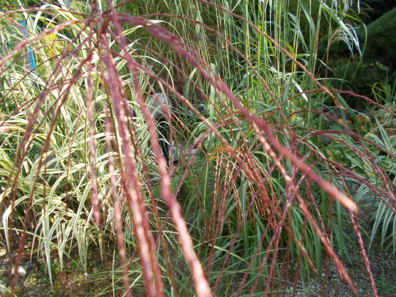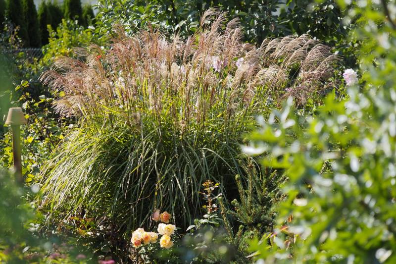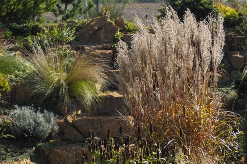 drugi z kwitnieniem zameldował się miskant Roter Pfeil - rośnie u podnóża skalniaka
