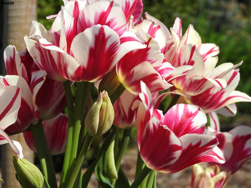Wysokość: 50 cm Kwiat: biały z czerwonymi smugami Kwitnienie: kwiecień/maj Wymagania: przeciętna ziemia ogrodowa z tendencją do lekko zasadowej, przepuszczalna Zapach: brak Mrozoodporność: dobra, można sadzić na terenie całego kraju