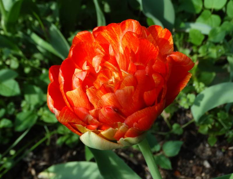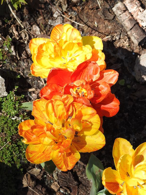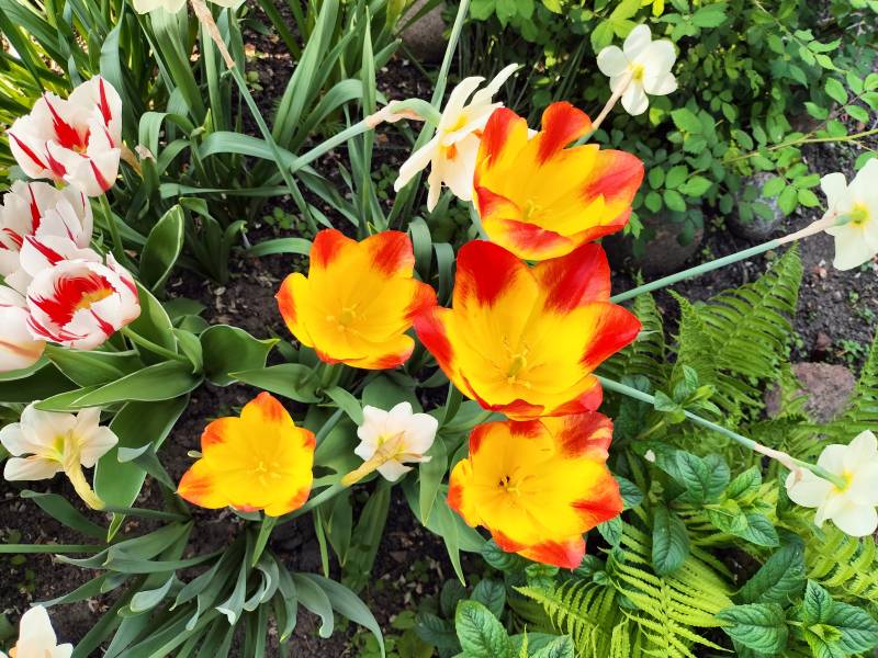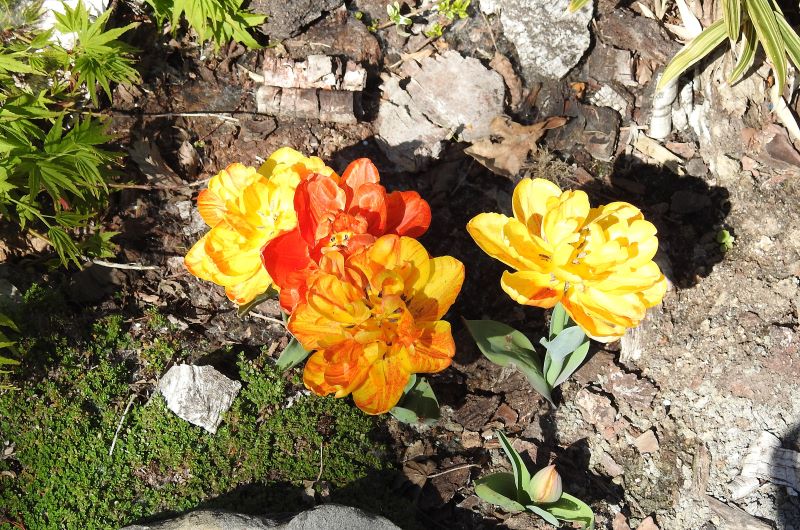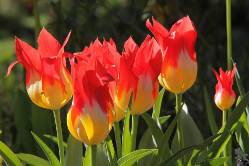 Tulipan Flaming Baby, niziutka odmiana o pełnych kwiatach w kolorze czerwieni, żółci i pomarańczy.