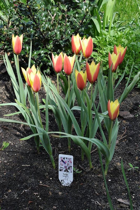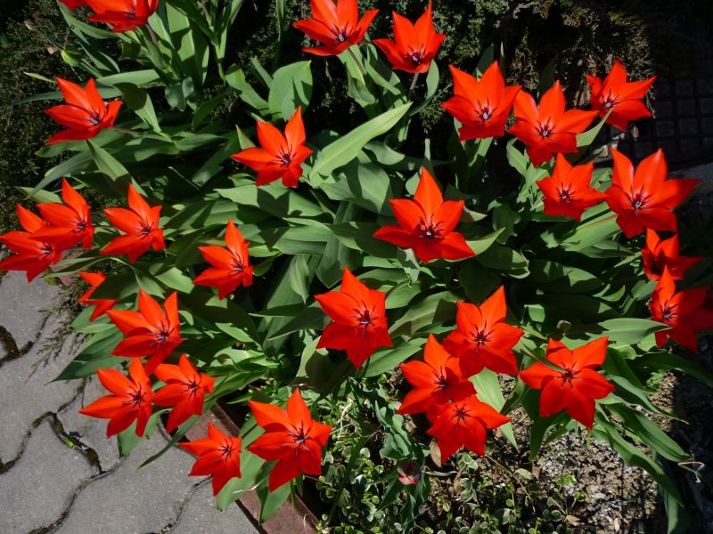 Tulipa fosteriana) - osiągają 30–40 cm, kwiaty ognistoczerwone, charakterystycznie rozwarte w drugiej fazie kwitnienia, liście z wąską brunatną obwódką. Kwitną na początku kwietnia.