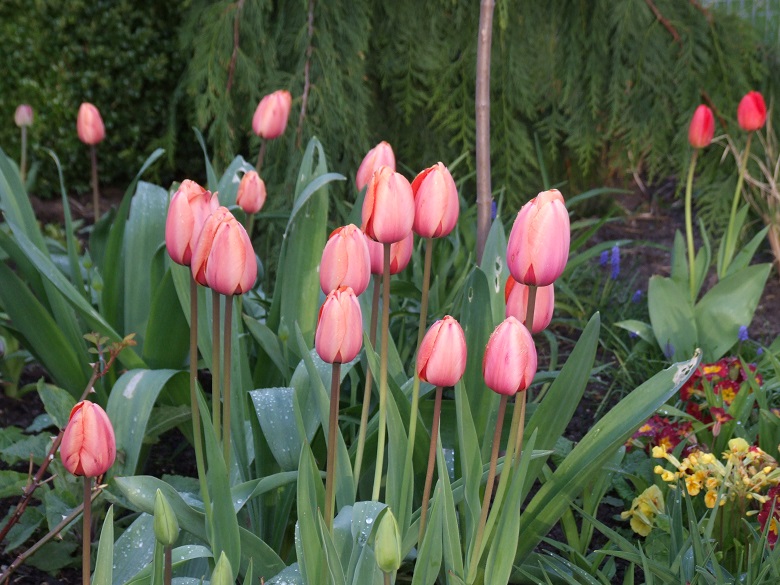 4 tulipany mieszańce Darwina - dorastają do 60 cm wysokości. Kwiaty owalne w kształcie, o lekko błyszczących jednobarwnych płatkach. Kwitną na przełomie kwietnia i maja. Prawdziwe hardcory, plenne i wytrzymałe!