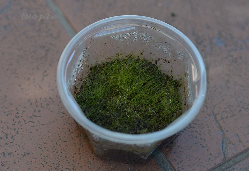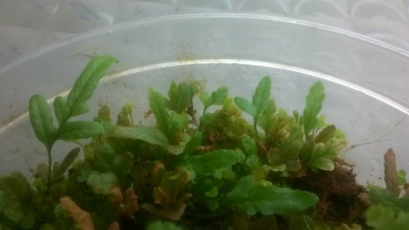 Równo po roku, w lutym 2018 r. zauważyłam malutkie listeczki na niteczkowatych łodyżkach, wiosną przestawiałam pojemnik na wschodnie okno nad kaloryferem, miało być jaśniej i cieplej, a w efekcie przesuszyłam. Wyniosłam pojemnik wiosną na zewnątrz w celu unicestwienia, ale dałam jeszcze szansę, przełożyłam to co zostało do nowego pojemnika, niższego, obsypałam przesianym kompostem, podlałam i postawiłam na zewnętrznym parapecie bez dostępu bezpośredniego słońca. Kiedy tam zajrzałam po pewnym czasie