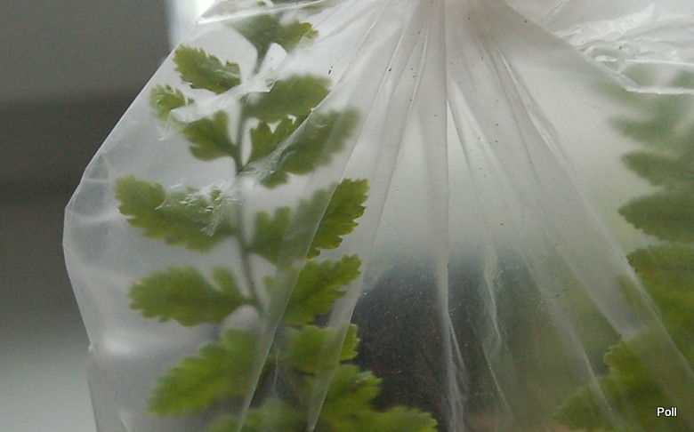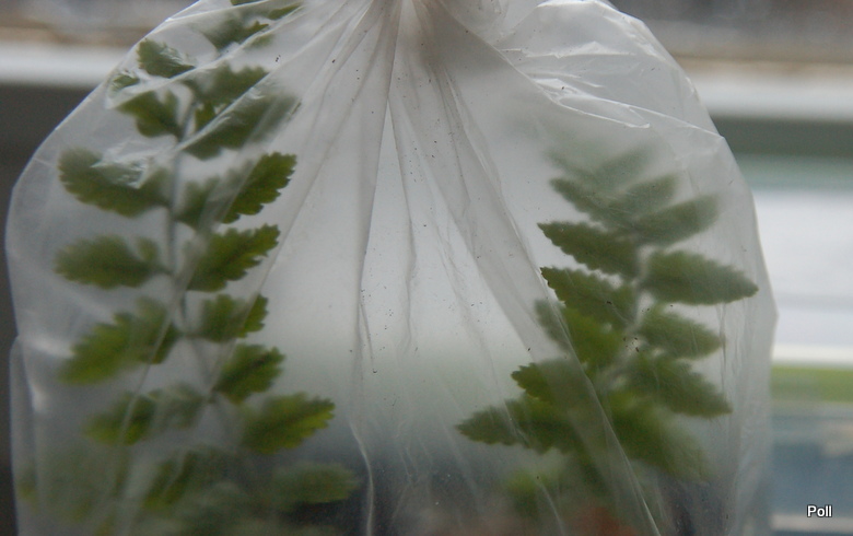 Część siewek umieściłam w małych doniczkach i umieściłam w zawiązanych woreczkach foliowych, które robią za szklarenki. Podzielony przeze mnie na cztery małe części, Dryopteris scottii także umieściłam w takich woreczkach. Wydaje mi się, ze dobrze się tam czują.