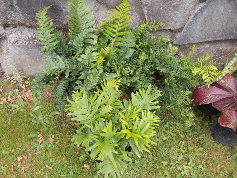 Po prawej Narecznica szerokolistna ’Lepidota Cristata’ , po lewej Paprotnik wielołuskowy ’Jade’ , a na środku paprotka zwyczajna ’Whitley Giant’