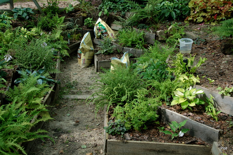 Na początku po prostu zebrałam paprocie w jednym miejscu, później stwierdziłam, iż należałoby je lepiej wyeksponować - stąd budowa stoku paprociowego. Później podjęłam decyzję o wydzieleniu z kolekcji nerecznic i zaplanowałam dla ich uprawy okrągły zagłębnik, który pozwalał na ich pietrowe nasadzanie. Świetnie się sprawdził, więc - dostosowując się do kształtu wolnego, w miarę cienistego miejsca - wyznaczyłam następny zagłębnik, tym razem dla wietlic. Wgłebione tarasy nieco urozmaicają moją płaską, jak stół działkę. Ich budowa jest prosta- wykop, zapieranie tarasów deskami, lub kamieniami, uzupełnianie ziemią ( zazwyczaj, jest to mój kompost, ale gdy go brakuje, wspieram się humusową ziemią Substrala). W Anglii mozna kupić w centrach ogrodniczych kompost na wagę- nabieramy tyle, ile potrzebujemy, ale mamy też mozliwość oceny, czy ziemia nam odpowiada (nie znoszę dużej ilości torfu ). Humus Substrala jest chyba najlepszą z kupnych ziem, jakie zdarzyło mi się spotkać. Jako podłoże dla paproci lubiących kwaśną glebę, mieszam go z moją rodzimą ziemią i przekompostowaną korą z trocinami.
