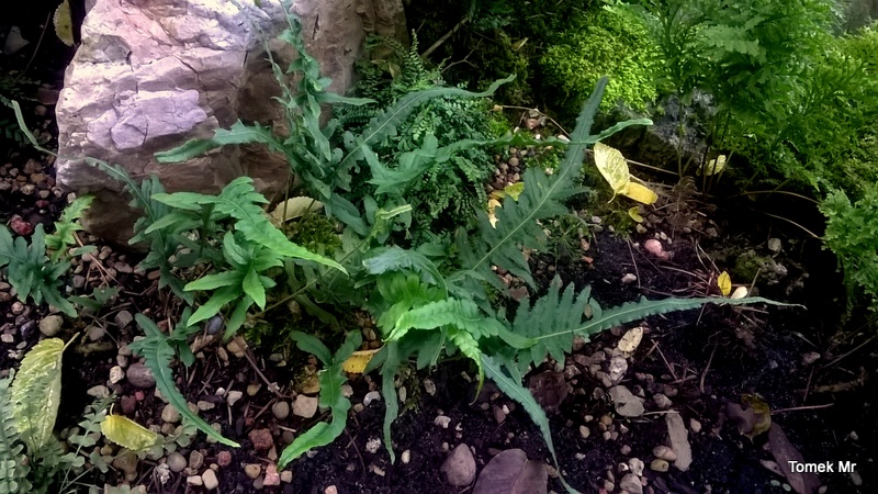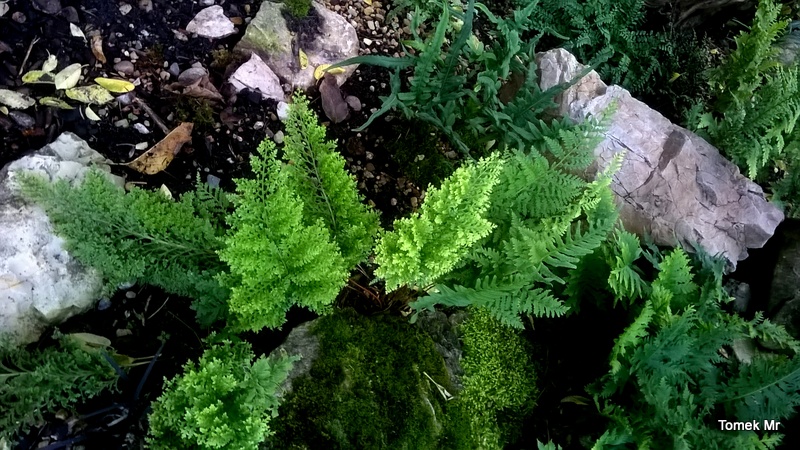 Najlepszym wypełniaczem, zwłaszcza, jeśli zastosujesz do dekoracji jakieś kamienie, czy korzenie, jest cudownie zwiewne Adiantum venustum. Nieźle tez wyglądają paprotki (Polypodium) i Adiantum pedatum sadzone w kilka kęp, w odległości ok. 30 cm.