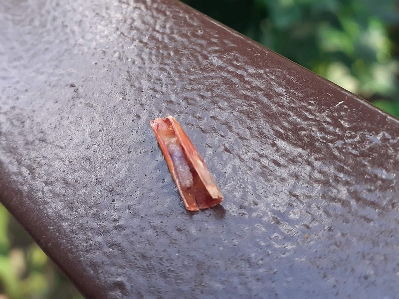 Robalowe dziadostwo kontratakuje... 037 w tym roku larwy dobrały się do paprotki 'Omnilacerum Superbum'... objawy tak jak przed rokiem u wietlic - liść wyglądał na zwiędnięty a że był to młody przyrost, dotknęłam i został mi w ręku... zajrzałam i zobaczyłam, że w środku coś mi się fioletowi... to był wieczór, zdjęcie z dziś po kilkunastu godzinach od zauważenia, stąd robal już martwy