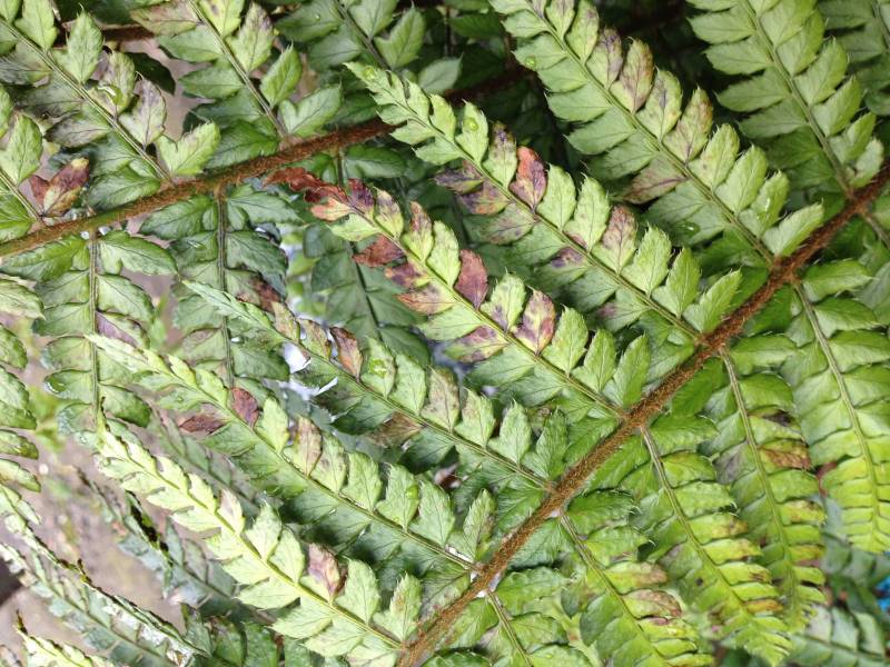 Na moich paprotnikach makinoi pojawiły się plamy. Najpierw były na jednym, który byl lekko żółty (i w ogóle gorzej rósł, ale to byc może z winy dławiącego go dławisza, którego już od wiosny nie ma), a teraz na drugim, który dotychczas był ok. Oba egzemplarze rosną na podobnym stanowisku trzeci sezon. Czy to grzyb, czy raczej problem z ziemią, czy jeszcze coś inszego? Plamy są na młodych, tegorocznych frondach, które początkowo były śliczne i zielone (chyba je pokazywałam w tym roku).