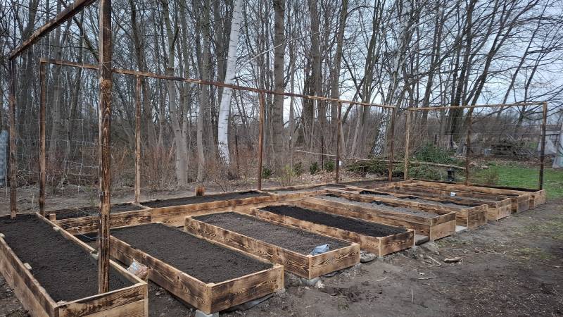 Są tam ponownie wysiane do pojemników groszki cukrowe i bób orazpor, cebula, buraki naciowe, rukola, koper i sałata.