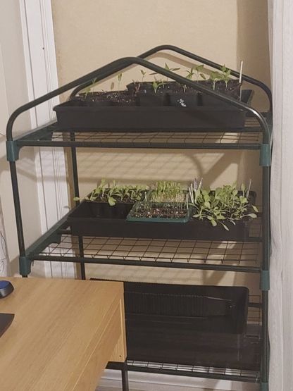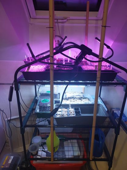 Wśród tego bałaganu znajdą się też rośliny ozdobne - siewki ozdobnej marchwi z różowym kwiatem, didiskus (ledwo co powschodził) i karpy dalii w donicach.