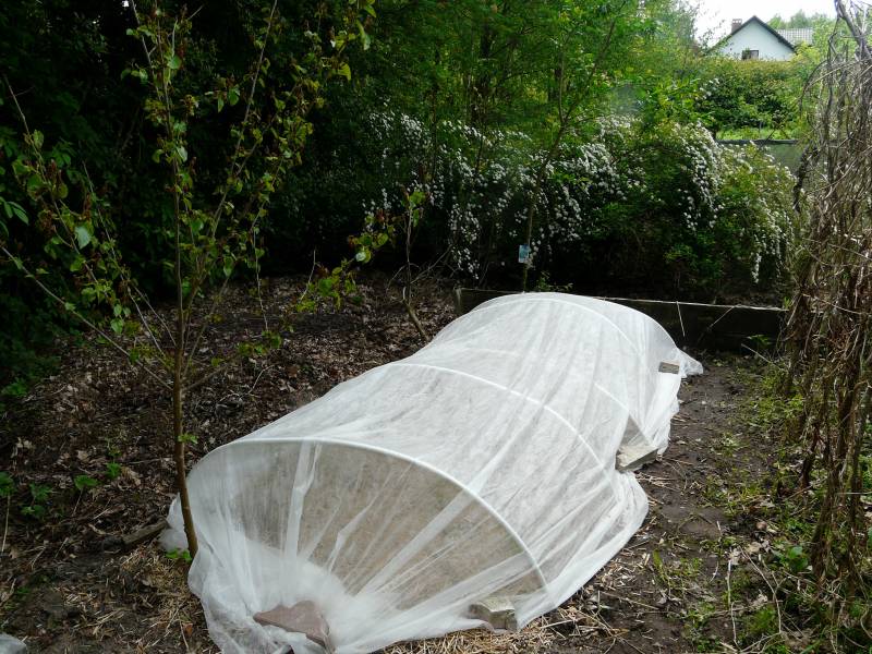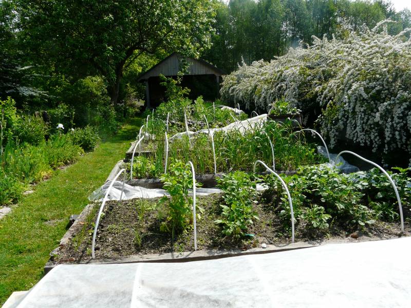 Pomidory, papryki i ogórki wysadzone do gruntu od razu dostały płaszczyki z agrowłókniny.