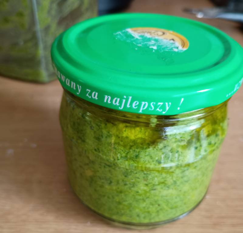 Ale za to eksperymentuję z kolejnym pesto, tym razem po raz pierwszy z liści chrzanu, który też u mnie rośnie :witaj