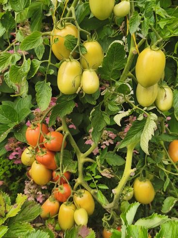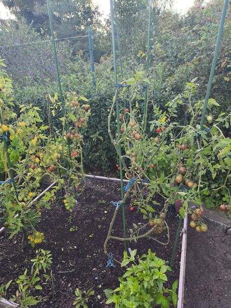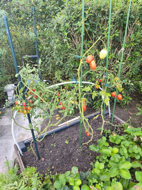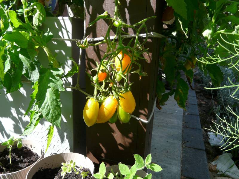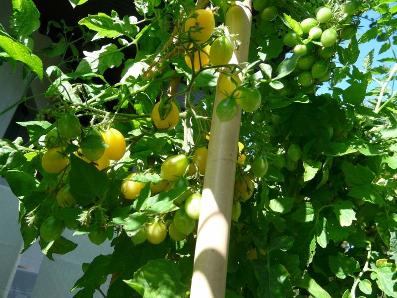 Pomidorki koktailowe jeszcze dojrzewają i o dziwo w miarę zdrowe są (to chyba zasługa tych miedzianych drucików. Liście sama oberwałam, żeby miały więcej światła.