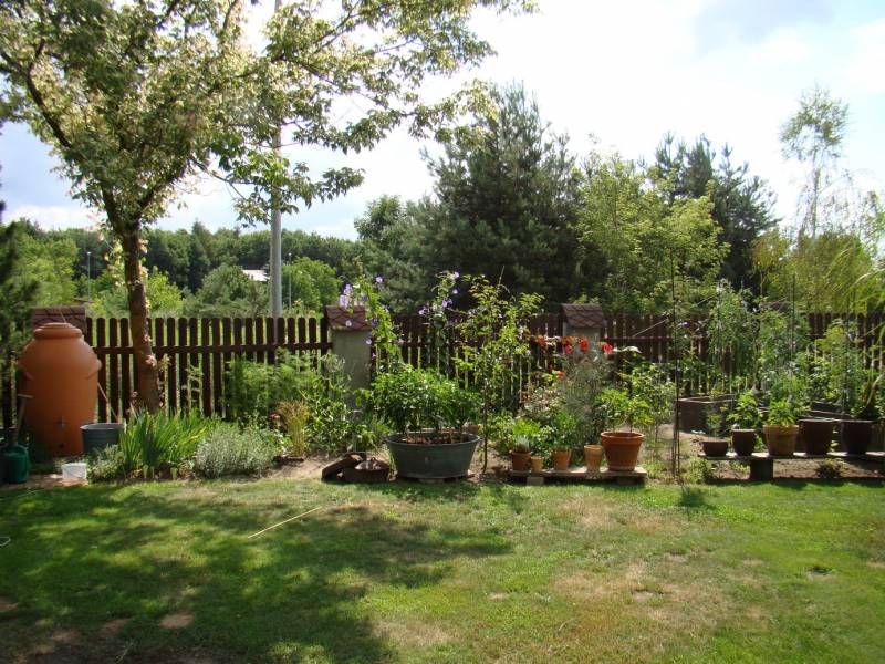 Wszystko tam jest- nieduże drzewka owocowe, warzywa w skrzyniach i pojemnikach i część roślin, szczególnie kwiatów, w gruncie. Bardzo me gusta.
