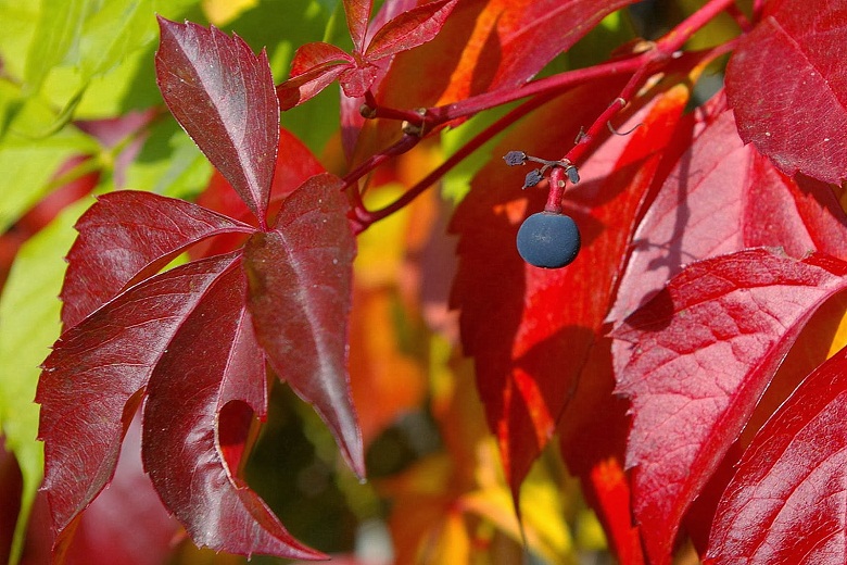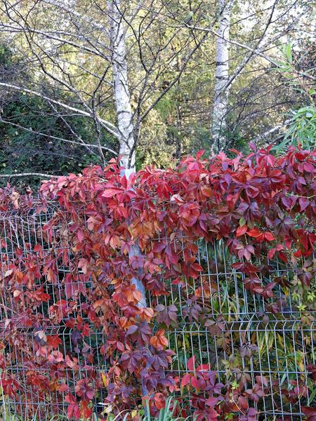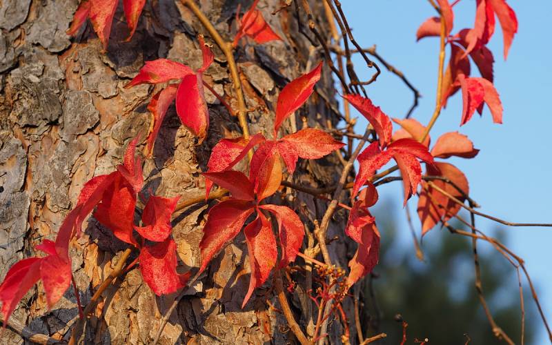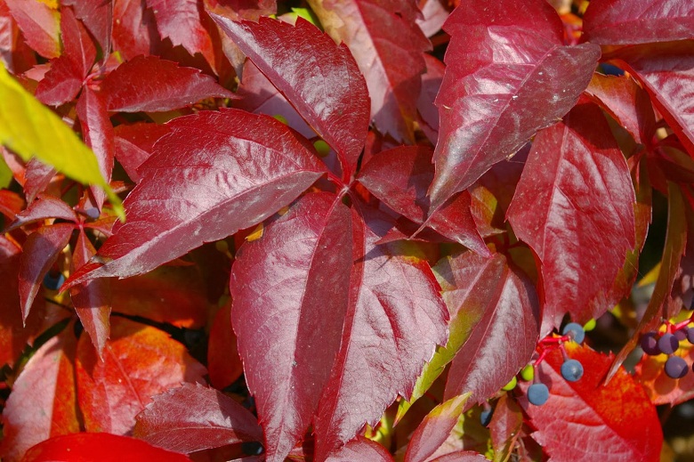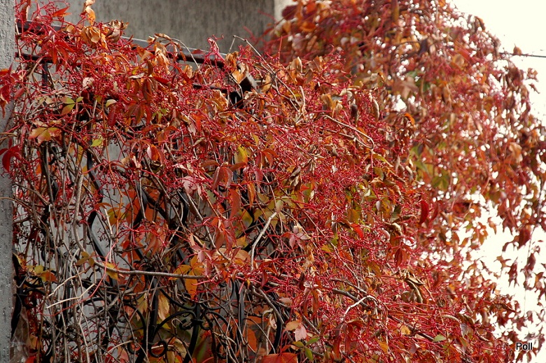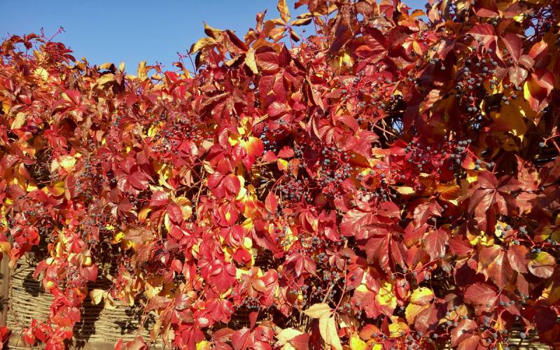 Widok czerwieniejących winobluszczowych listków i granatowych jagód, to dla mnie clou jesieni, zwłaszcza w słoneczne dni. Lubię go fotografować a przy tym wyszukiwać ciekawie wybarwione liście. Czerwienieją bowiem tam, gdzie dochodzą promienie słoneczne. Jeśli połowa liścia jest w słońcu a druga schowana pod innym liściem, mamy czerwono-zielony, jakby podkolorowany w photoszopie obrazek.
