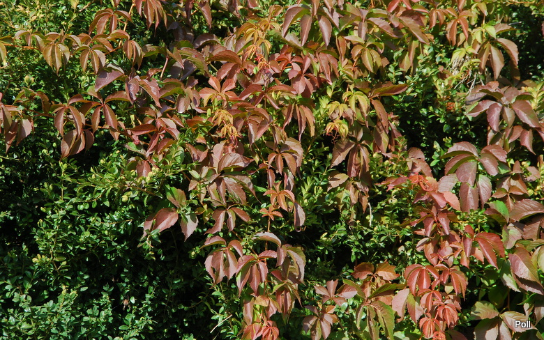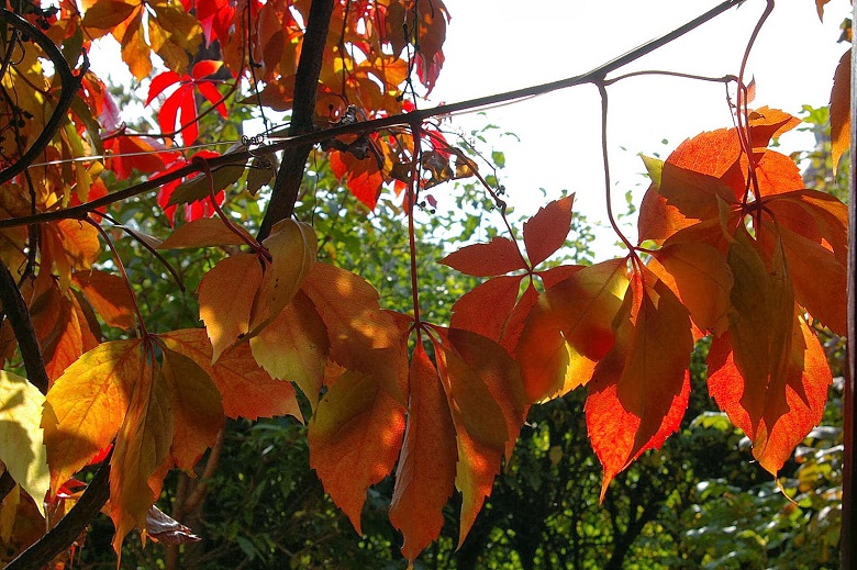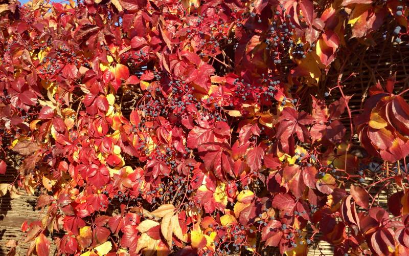 Widok czerwieniejących winobluszczowych listków i granatowych jagód, to dla mnie clou jesieni, zwłaszcza w słoneczne dni. Lubię go fotografować a przy tym wyszukiwać ciekawie wybarwione liście. Czerwienieją bowiem tam, gdzie dochodzą promienie słoneczne. Jeśli połowa liścia jest w słońcu a druga schowana pod innym liściem, mamy czerwono-zielony, jakby podkolorowany w photoszopie obrazek.