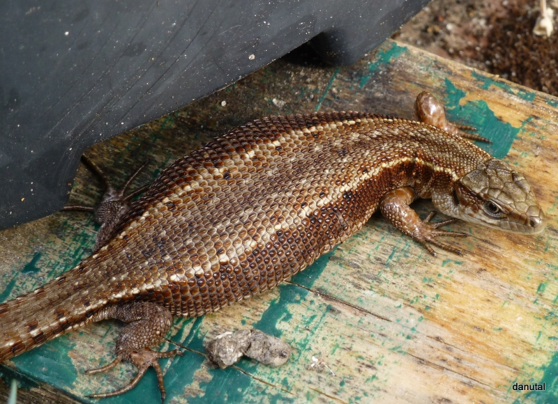 Każdego roku, od wielu lat, pojawia się u mnie w ogrodzie. Nie jest wcale płochliwa, aparat mogłam zbliżyć na odległość 5 cm. Nie wiem , bo nie potrafię odróżnić, czy jest to jaszczurka żyworodna czy nie. Wygląda mi na bardzo "spasioną".