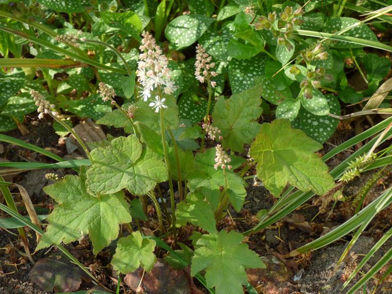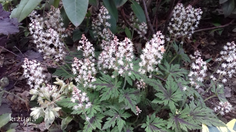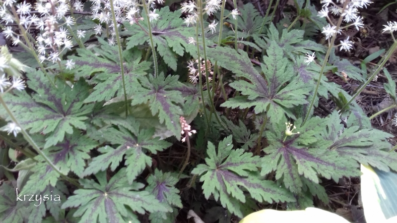 Chocolate Ruffles - wygląda spod hortensji, którą nazywam "Chełmska", ponieważ tam jest b. popularna i stamtąd ze mną przyjechała.
