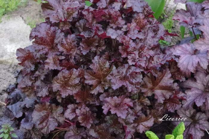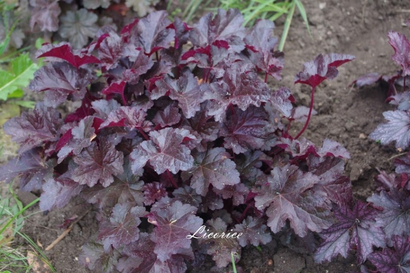 Rodzaj: Żurawka (Heuchera) Odmiana: Licorice Wymiary : odmiana tworząca kępy o szerokości 40 cm i wysokości 30 cm/60 cm z kwiatostanem. Kolorystyka: liście ciemne, błyszczące z nieregularnym, srebrnymi plamami . Kwitnienie: białymi kwiatami od maja do lipca Warunki uprawy: stanowisko pół-cieniste/słoneczne, gleba próchniczna, żyzna, stale lekko wilgotna .