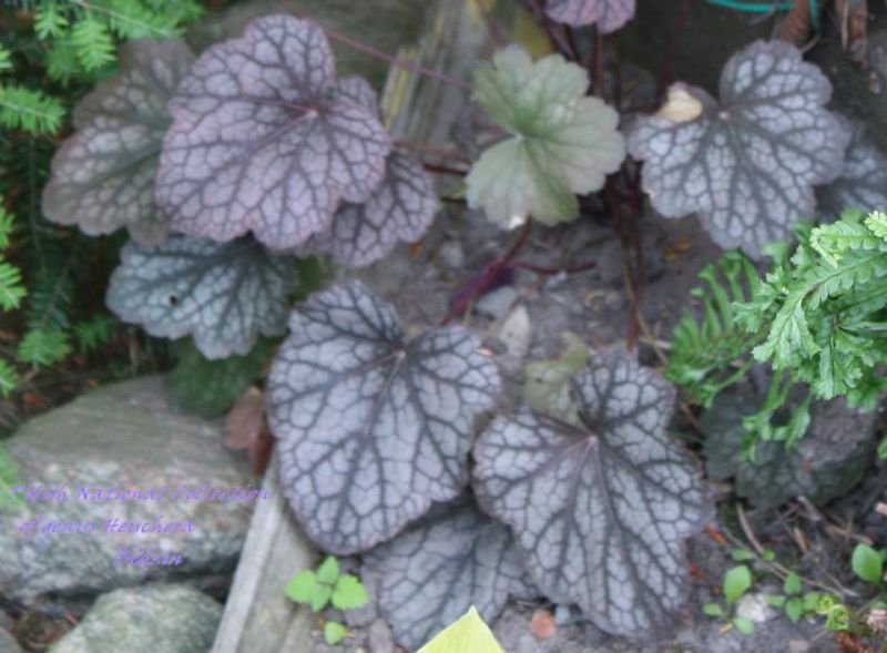 Rodzaj: Żurawka (Heuchera) Odmiana: Pewter Veil Wymiary: tworzy kępy o średnicy 60 cm i wysokości 30 cm/80 cm z kwiatostanem. Kolorystyka: liście srebrno-zielono-purpurowe z kontrastowym żyłkowaniem. Kwiaty: biało-zielone. Kwitnienie: od maja do lipca. Warunki: stanowisko pół-cieniste/cieniste.