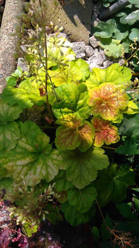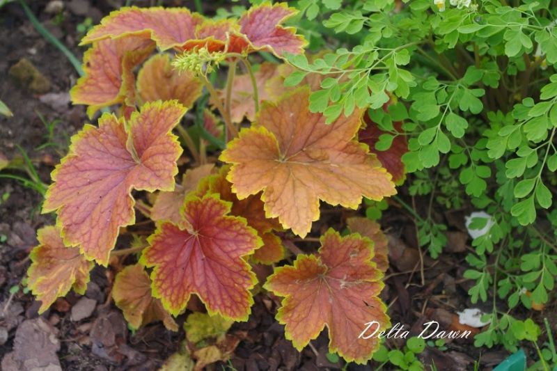 Rodzaj: Żurawka (Heuchera) Odmiana: Delta Dawn Wymiary: tworzy kępy o średnicy 30 cm i wysokości 20 cm/35 cm z kwiatostanem. Kolorystyka: czerwone liście z zielono- żółtą obwódką . Kwiaty: białe. Kwitnienie: od czerwca do sieprnia. Warunki: stanowisko pół-cieniste.