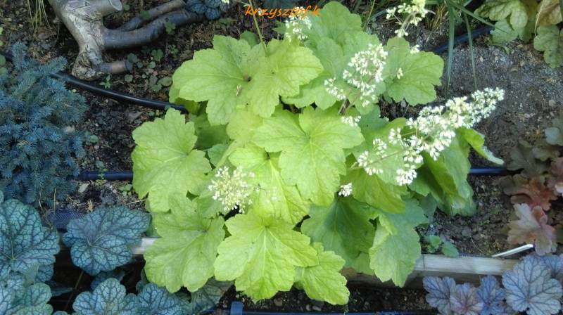 Rodzaj: Żurawka (Heuchera) Odmiana: Electric Lime Wymiary: tworzy kępy o średnicy 35 cm i wysokości 30 cm/40 cm z kwiatostanem. Kolorystyka: zielono-żółte z czerwonym żyłkowaniem . Kwiaty: białe. Kwitnienie: od maja do czerwca. Warunki: stanowisko cieniste.