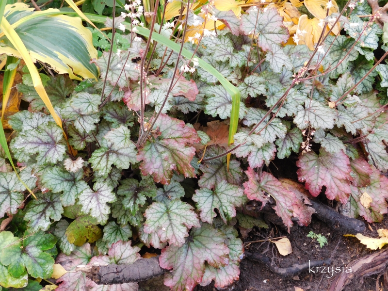 Rodzaj: Żuraweczka (Heucherella) Odmiana: Cracked Ice Wymiary : odmiana tworząca kępy o szerokości 40 cm i wysokości 15-20 cm/ 25 cm z kwiatostanem. Kolorystyka: liście srebrno-zielone z fioletowym marginesem i ciemnym żyłkowaniem . Kwiaty: białe. Kwitnienie: od czerwca do lipca. Warunki: stanowisko pół-cieniste/cieniste.