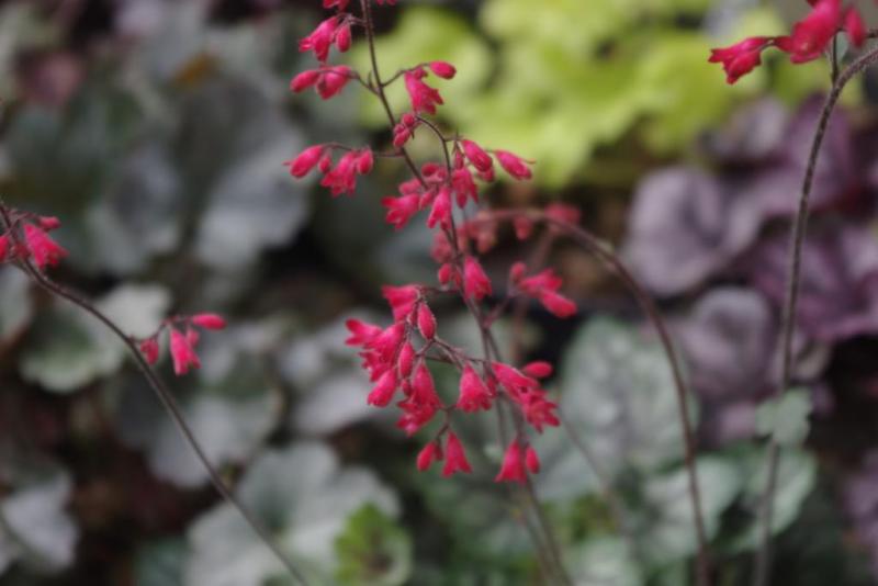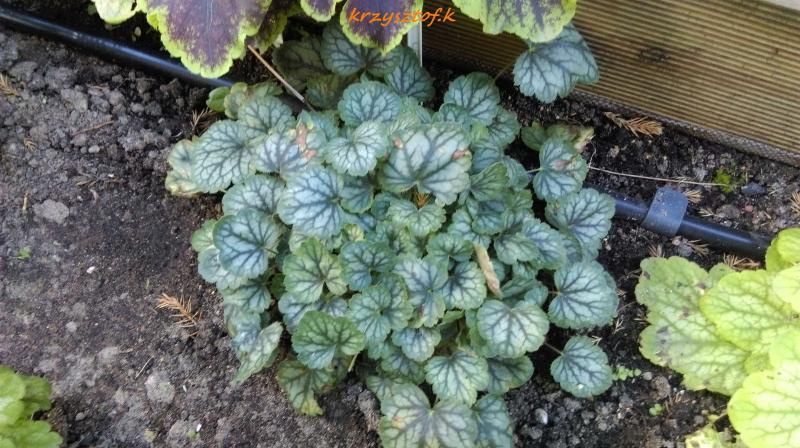 Rodzaj: Żurawka (Heuchera) Odmiana: Cezanne Wymiary : odmiana tworząca niewielkie kępy o szerokości 20 cm i wysokości 20 cm. Kolorystyka: liście srebrno-szare z zieloną obwódką. Kwiaty: czerwone. Kwitnienie: na początku lipca do września. Warunki: stanowisko pół-cieniste/słoneczne. Wrzesień, stanowisko: półcień