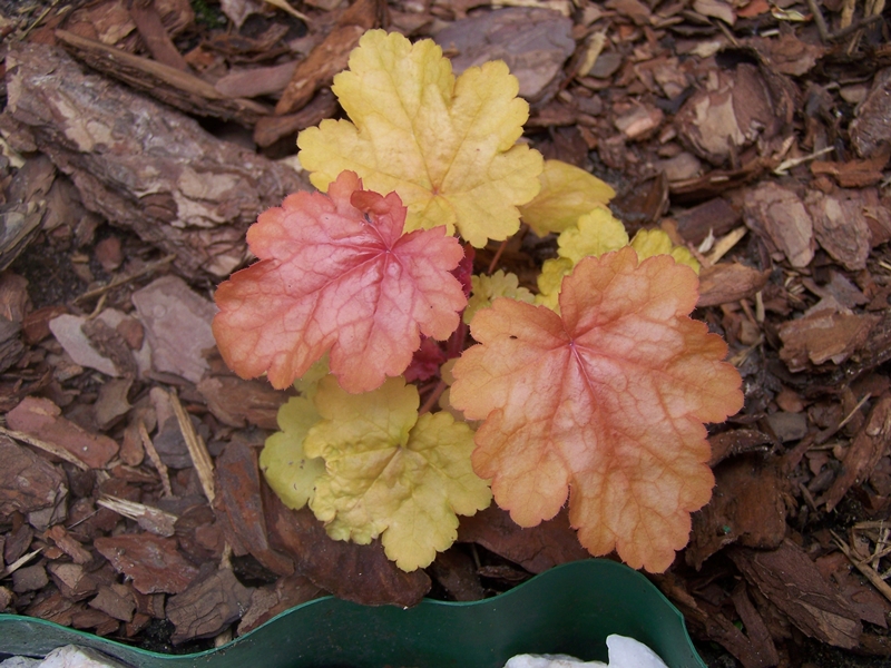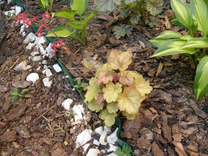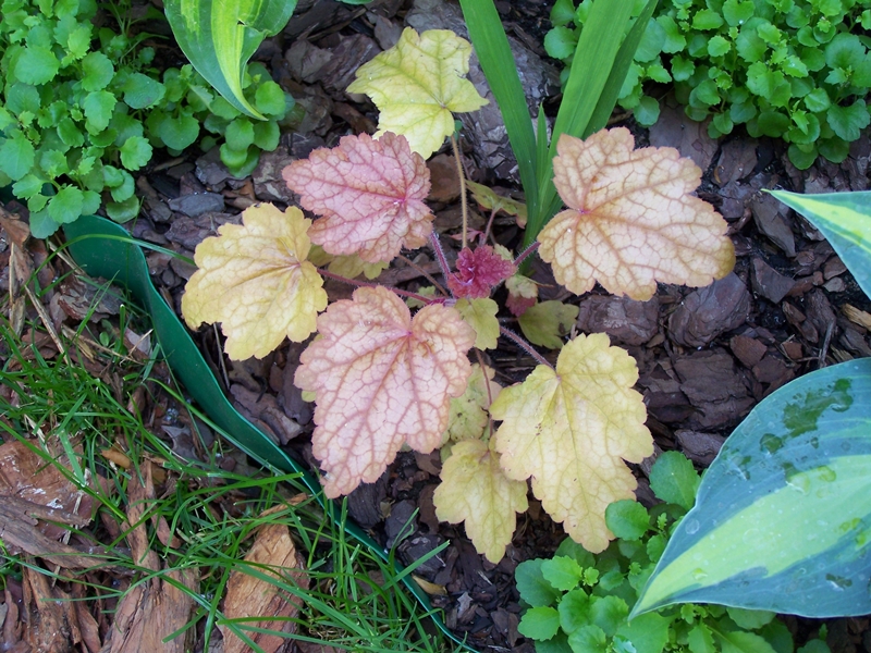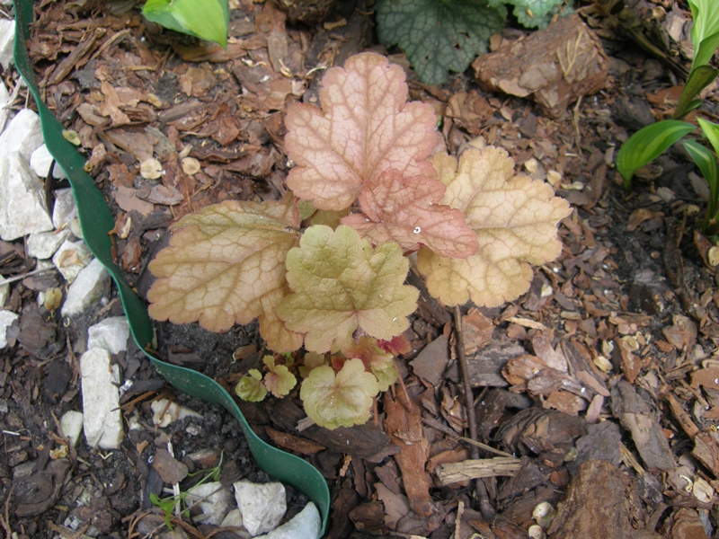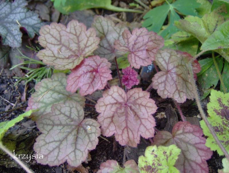 Rodzaj: Żurawka (Heuchera) Odmiana: Vulcano Wymiary: tworzy kępy o szerokości 30 cm i wysokości 20 cm Kolorystyka: liście w różnych odcieniach bursztynu z ciemniejszymi żyłkami Kwiaty: jasno różowe Kwitnienie: od czerwca do sierpnia Warunki: stanowisko od półcienia do słońca,