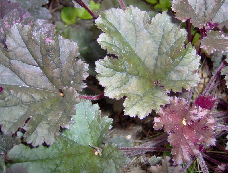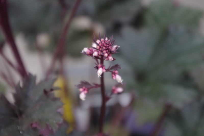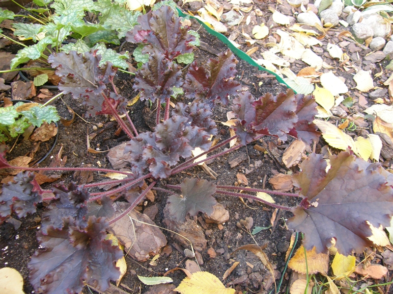 Rodzaj: Żurawka (Heuchera) Odmiana: Dark Secret Wymiary : odmiana tworząca kępy o szerokości 40 cm i wysokości 25 cm/70 cm z kwiatostanem. Kolorystyka: ciemno fioletowe, prawie czarne liście . Spód liścia purpurowy. Kwiaty:białe. Kwitnienie: od maja do sierpnia. Warunki: stanowisko słoneczne .
