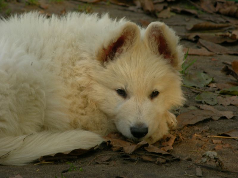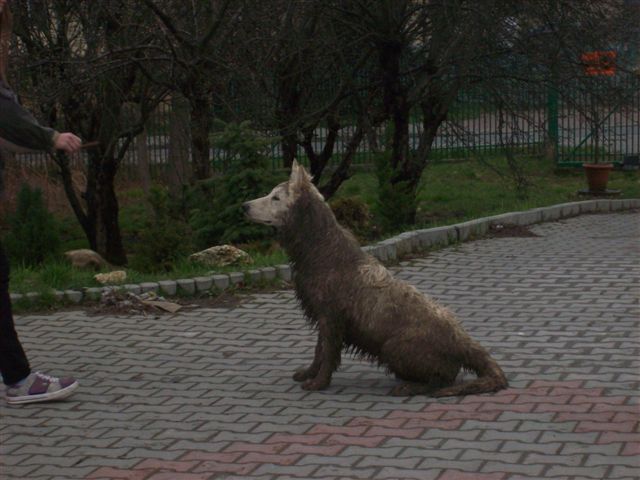 A teraz pielęgnacja. Wbrew pozorom, mimo, iż szatę mają białą to nie wymagają jakiejś niebywałej pielęgnacji. Ich szata ze względu na budowę włosa okrywowego ma zdolność samooczyszczania (np. maltańczyk też jest biały,ale jego jedwabisty włos wymaga czestego prania). Co to oznacza w praktyce - jeśli wrócisz z psem ze spaceru, a on będzie miał na sobie piach i błoto to jeśli tylko masz taką możliwość to zostaw go gdzieś do wyschnięcia, nie wycieraj, nie wcieraj tego błota w podszerstek. Po wyschnięciu sierści piach spada na posłanie a pies jest nadal biały. Oczywiście warto go wówczas (po wyschnięciu, nie przed!) wyczesać/odkurzyć odkurzaczem by usunąć kurz, a z posłania zmieść górkę piasku ;-) Jeśli tym błotem jest glina i jest jej dużo np. tyle: