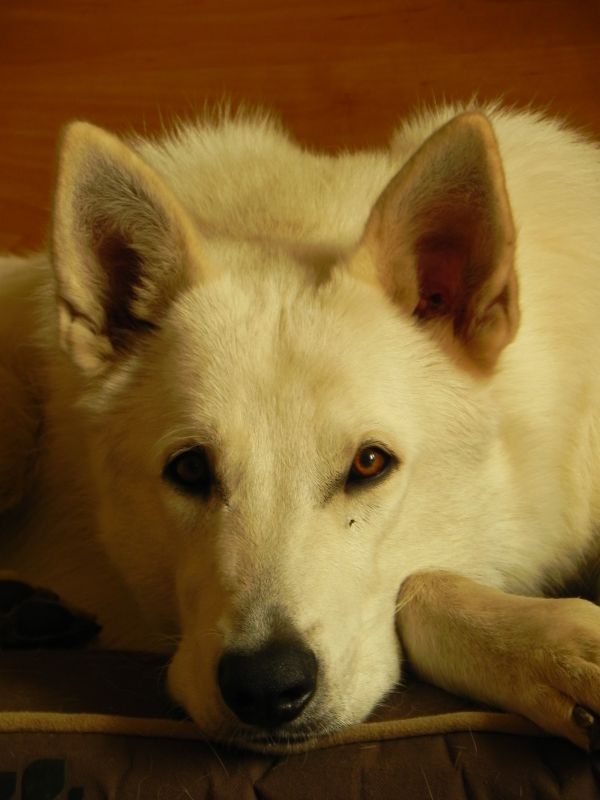 Roszka jest nietypowym białym owczarkiem, każdy kto ją zna wie, że więcej w zachowaniu ma z goldena niż owczarka ;-) kocha cały świat i wszystkich ludzi, każdemu z gości próbuje wejść (dosłownie) na kolana :blink: Miała u mnie jeden miot, jest mamą Fary i Fibi, ale o nich później, teraz jest już na emeryturze :-)