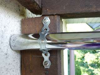 Rurki prowadzące przymocujemy do pergoli za pomocą blaszek. Dzięki temu cała konstrukcja łatwo zostanie rozmontowana na zimę. Boczne rurki są poniżej górnej belki pergoli. Środkowa rurka umocowana jest wyżej, aby uzyskać spad .